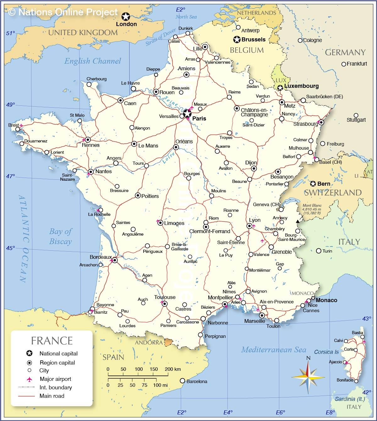 Internationale Flughäfen in der Karte von Frankreich